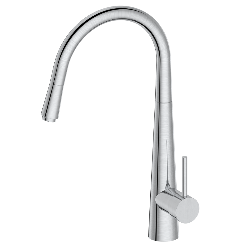 This 360° swivel pull-out kitchen mixer tap features a durable food-grade brass construction and a scratch-resistant brushed stainless steel finish. Its high-arc spout rotates 360° for full sink coverage, and the pull-out spray head offers flexible reach for thorough cleaning. The single lever handle allows intuitive one-handed control of water temperature and flow, while the precision ceramic valve core ensures over 500,000 leak-free cycles. Designed for easy deck-mounted installation, it suits both residential kitchens and commercial spaces, with customizable finishes and branding available. |