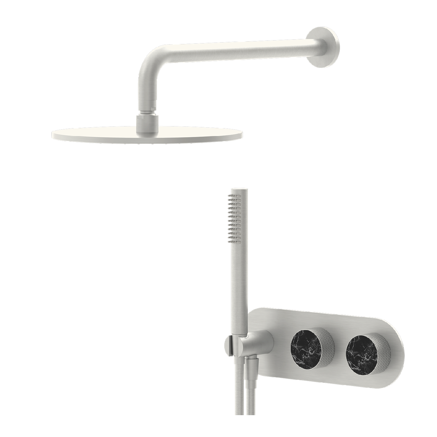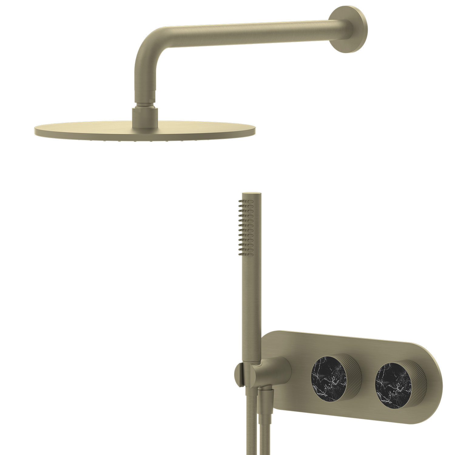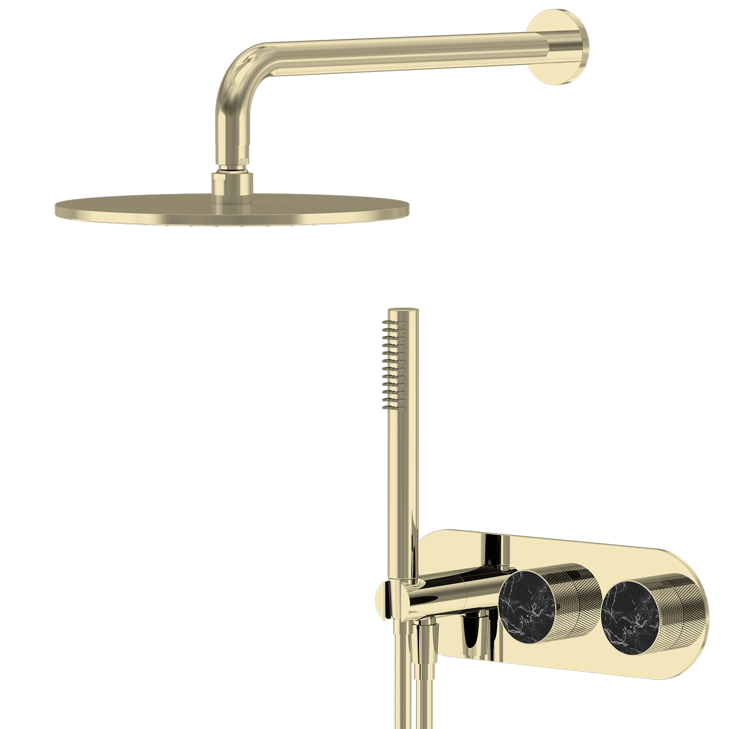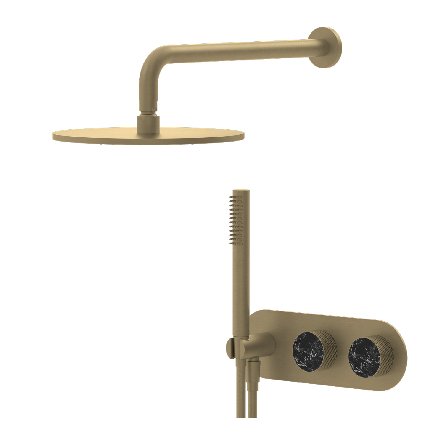 74 Series Handheld & Overhead Shower Set is a luxury wall-mounted shower system designed for premium bathroom spaces, combining modern aesthetics with durable, high-performance engineering. Crafted from high-grade brass, this premium shower set delivers exceptional corrosion resistance and long service life. The brushed gold electroplated finish enhances durability, effectively resisting scratches, rust, and fading in humid bathroom environments, making it ideal for modern bathroom shower upgrades. Its distinctive design features natural black marble decorative accents on the dual-control knobs, showcasing a deep black tone enriched with dynamic white veining that creates a bold, high-contrast visual statement. Each marble insert is naturally unique, reinforcing the exclusivity and artisanal quality of the product. The knobs are further refined with precision-crafted knurled metal edges, adding a tactile, industrial-luxury detail while enhancing grip and usability. This combination of polished black marble and textured brushed gold metal forms a sophisticated material contrast, elevating the overall design language of the shower fixture. Perfectly paired with the brushed gold body, it creates a refined luxury shower fixture for contemporary and minimalist interiors. The recessed wall-mounted installation maximizes space efficiency, making this dual shower head system suitable for both compact bathrooms and high-end architectural projects. Textured knobs provide non-slip, precise control of water temperature and flow, ensuring ease of use and comfort. The system includes a multi-mode handheld shower with silicone nozzles for easy limescale removal, supporting spray functions such as rainfall shower and massage spray, along with a matching overhead rainfall shower head. This handheld and overhead shower set offers a fully customizable and spa-like shower experience. Equipped with a high-performance ceramic valve core rated for over 1,000,000 on-off cycles, the 74 Series ensures leak-proof operation and consistent water flow. Compatible with hot and cold water systems, this modern shower system is suitable for both residential and commercial applications. Certified by Watermark, it meets international quality and safety standards, supporting global market requirements. Customization services are available for bulk engineering projects, including surface finish customization and logo engraving, allowing seamless integration into various design concepts. Ideal for luxury hotels, villas, boutique apartments, and high-end renovations, the 74 Series luxury shower set delivers a perfect balance of functionality, durability, and sophisticated design. |