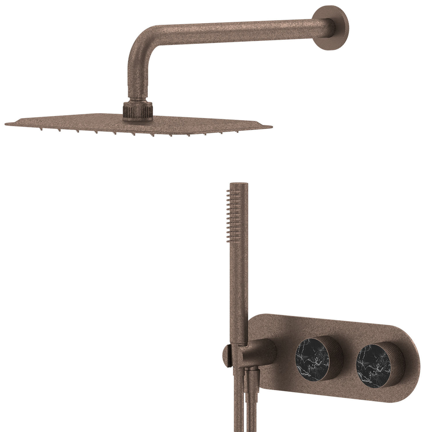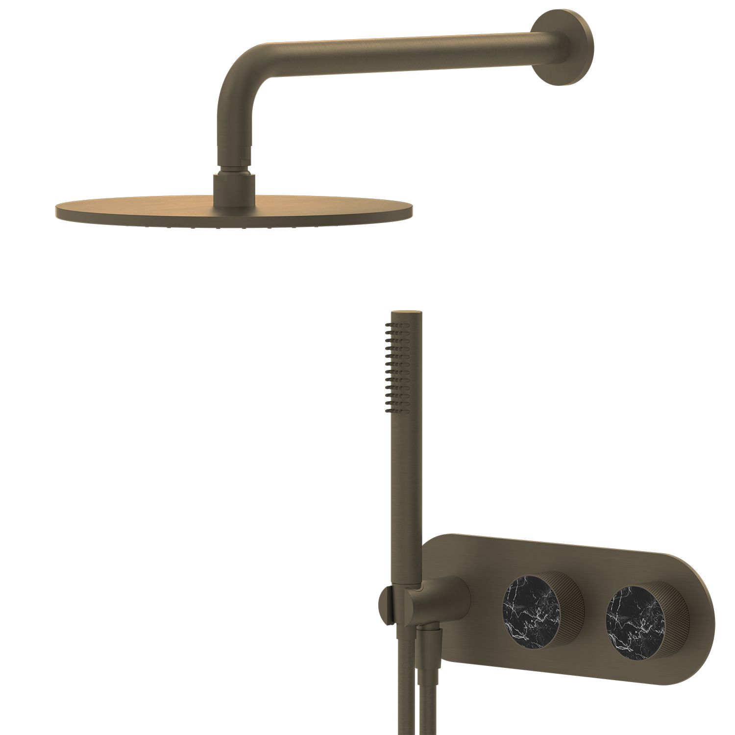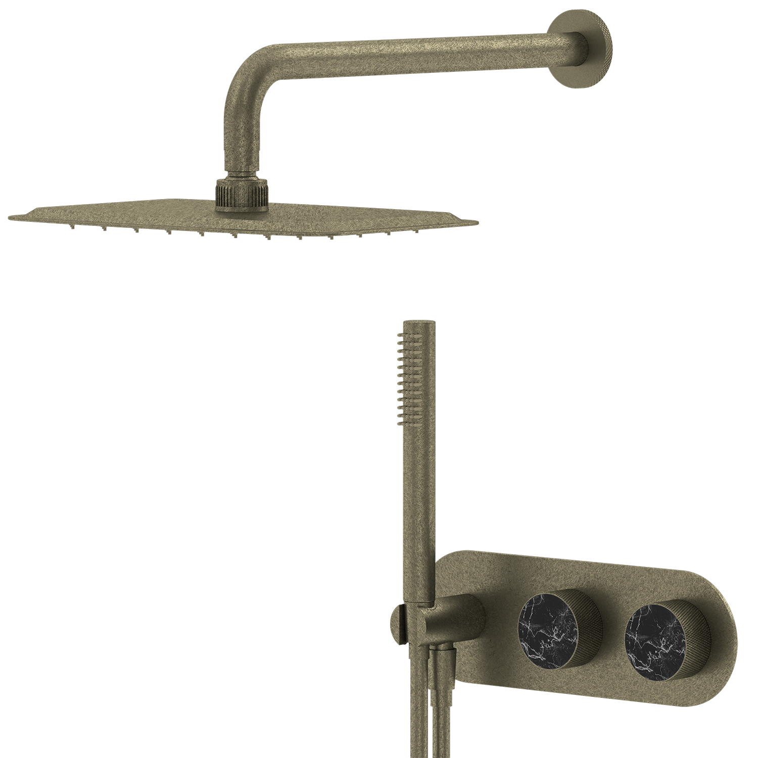 74 Series Handheld & Overhead Shower Set is a luxury wall-mounted shower system designed for premium bathroom spaces, combining modern aesthetics with durable, high-performance engineering. Crafted from high-grade brass, this premium shower set delivers exceptional corrosion resistance and long service life. The brushed gold electroplated finish enhances durability, effectively resisting scratches, rust, and fading in humid bathroom environments, making it ideal for modern bathroom shower upgrades. Its distinctive design features natural black marble decorative accents on the dual-control knobs, showcasing a deep black tone enriched with dynamic white veining that creates a bold, high-contrast visual statement. Each marble insert is naturally unique, reinforcing the exclusivity and artisanal quality of the product. The knobs are further refined with precision-crafted knurled metal edges, adding a tactile, industrial-luxury detail while enhancing grip and usability. This combination of polished black marble and textured brushed gold metal forms a sophisticated material contrast, elevating the overall design language of the shower fixture. Perfectly paired with the brushed gold body, it creates a refined luxury shower fixture for contemporary and minimalist interiors. The recessed wall-mounted installation maximizes space efficiency, making this dual shower head system suitable for both compact bathrooms and high-end architectural projects. Textured knobs provide non-slip, precise control of water temperature and flow, ensuring ease of use and comfort. The system includes a multi-mode handheld shower with silicone nozzles for easy limescale removal, supporting spray functions such as rainfall shower and massage spray, along with a matching overhead rainfall shower head. This handheld and overhead shower set offers a fully customizable and spa-like shower experience. Equipped with a high-performance ceramic valve core rated for over 1,000,000 on-off cycles, the 74 Series ensures leak-proof operation and consistent water flow. Compatible with hot and cold water systems, this modern shower system is suitable for both residential and commercial applications. Certified by Watermark, it meets international quality and safety standards, supporting global market requirements. Customization services are available for bulk engineering projects, including surface finish customization and logo engraving, allowing seamless integration into various design concepts. Ideal for luxury hotels, villas, boutique apartments, and high-end renovations, the 74 Series luxury shower set delivers a perfect balance of functionality, durability, and sophisticated design. |