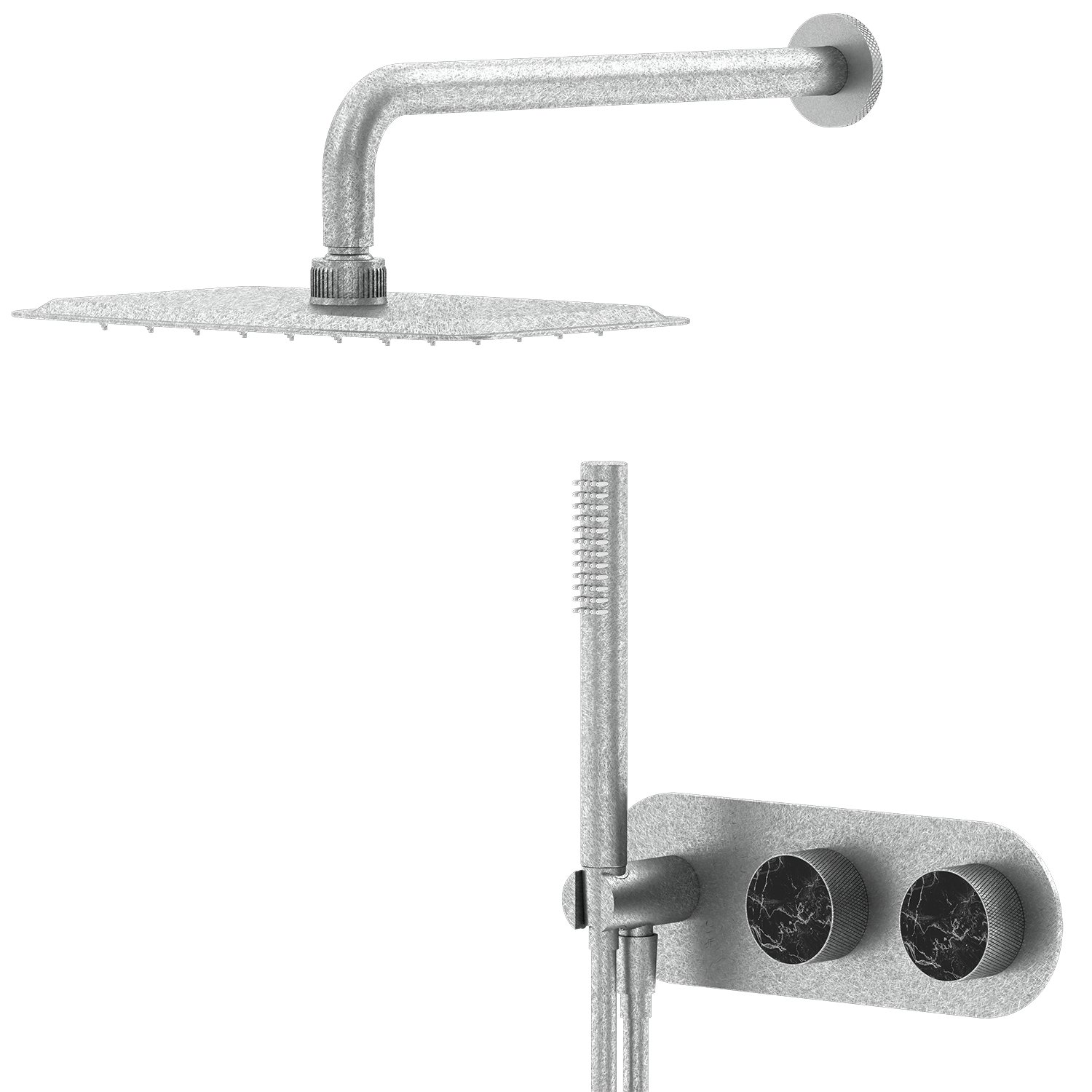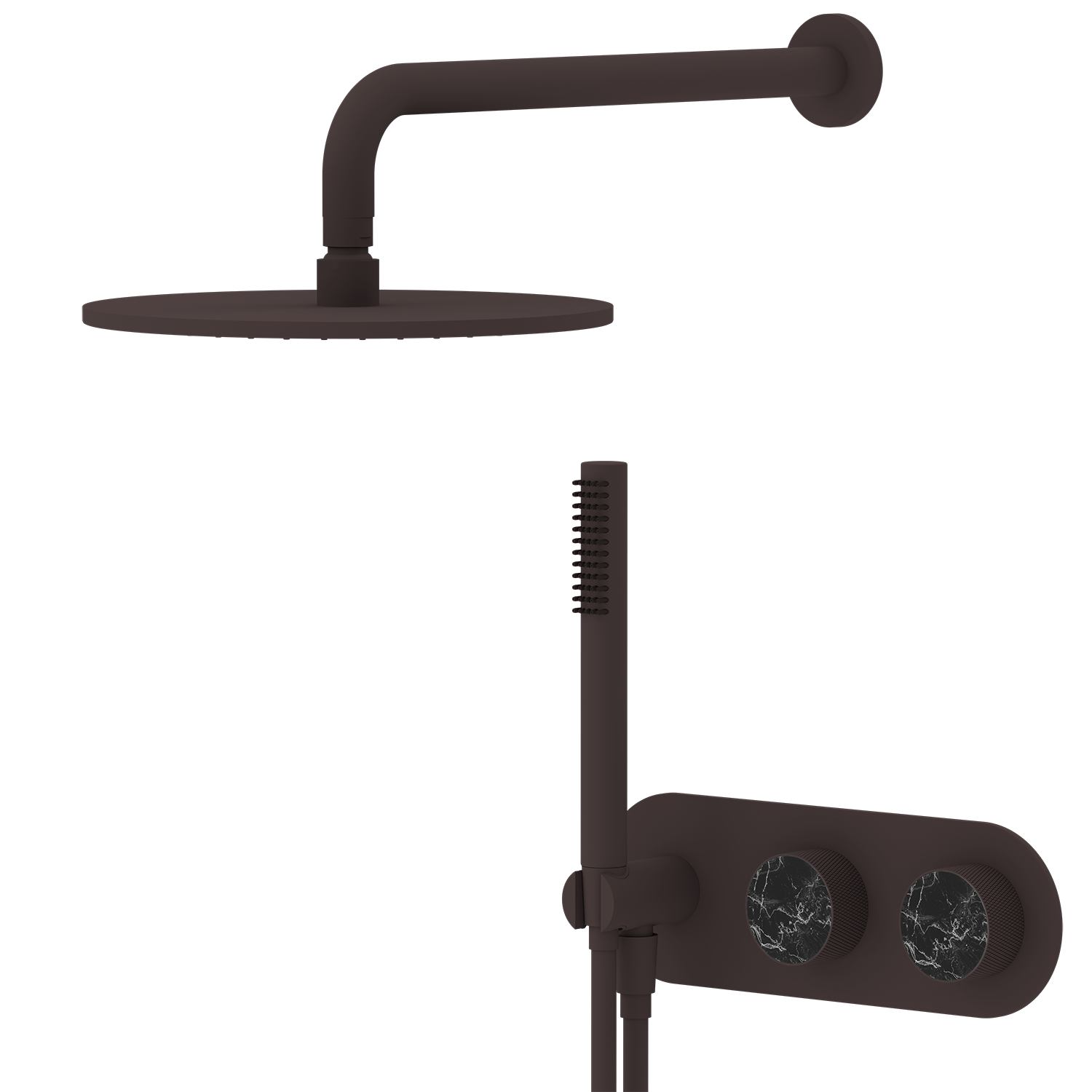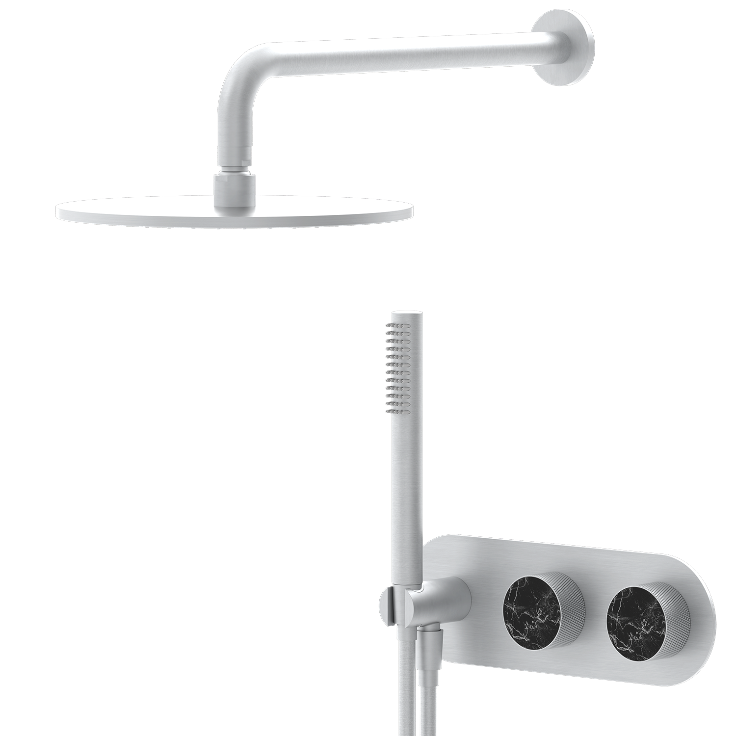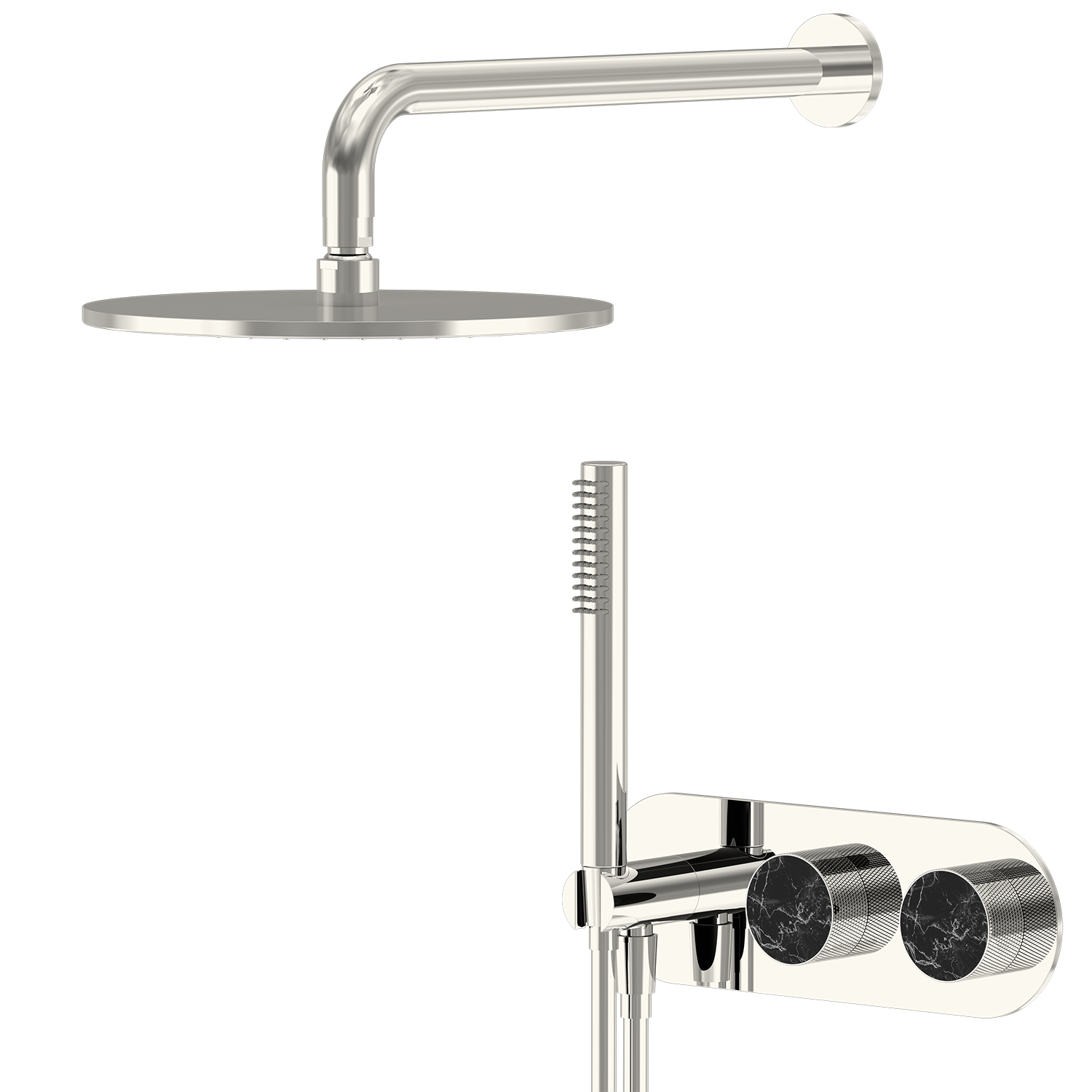 74 Series Handheld & Overhead Shower Set is a luxury wall-mounted shower system designed for premium bathroom spaces, combining modern aesthetics with durable, high-performance engineering. Crafted from high-grade brass, this premium shower set delivers exceptional corrosion resistance and long service life. The brushed gold electroplated finish enhances durability, effectively resisting scratches, rust, and fading in humid bathroom environments, making it ideal for modern bathroom shower upgrades. Its distinctive design features natural black marble decorative accents on the dual-control knobs, showcasing a deep black tone enriched with dynamic white veining that creates a bold, high-contrast visual statement. Each marble insert is naturally unique, reinforcing the exclusivity and artisanal quality of the product. The knobs are further refined with precision-crafted knurled metal edges, adding a tactile, industrial-luxury detail while enhancing grip and usability. This combination of polished black marble and textured brushed gold metal forms a sophisticated material contrast, elevating the overall design language of the shower fixture. Perfectly paired with the brushed gold body, it creates a refined luxury shower fixture for contemporary and minimalist interiors. The recessed wall-mounted installation maximizes space efficiency, making this dual shower head system suitable for both compact bathrooms and high-end architectural projects. Textured knobs provide non-slip, precise control of water temperature and flow, ensuring ease of use and comfort. The system includes a multi-mode handheld shower with silicone nozzles for easy limescale removal, supporting spray functions such as rainfall shower and massage spray, along with a matching overhead rainfall shower head. This handheld and overhead shower set offers a fully customizable and spa-like shower experience. Equipped with a high-performance ceramic valve core rated for over 1,000,000 on-off cycles, the 74 Series ensures leak-proof operation and consistent water flow. Compatible with hot and cold water systems, this modern shower system is suitable for both residential and commercial applications. Certified by Watermark, it meets international quality and safety standards, supporting global market requirements. Customization services are available for bulk engineering projects, including surface finish customization and logo engraving, allowing seamless integration into various design concepts. Ideal for luxury hotels, villas, boutique apartments, and high-end renovations, the 74 Series luxury shower set delivers a perfect balance of functionality, durability, and sophisticated design. |