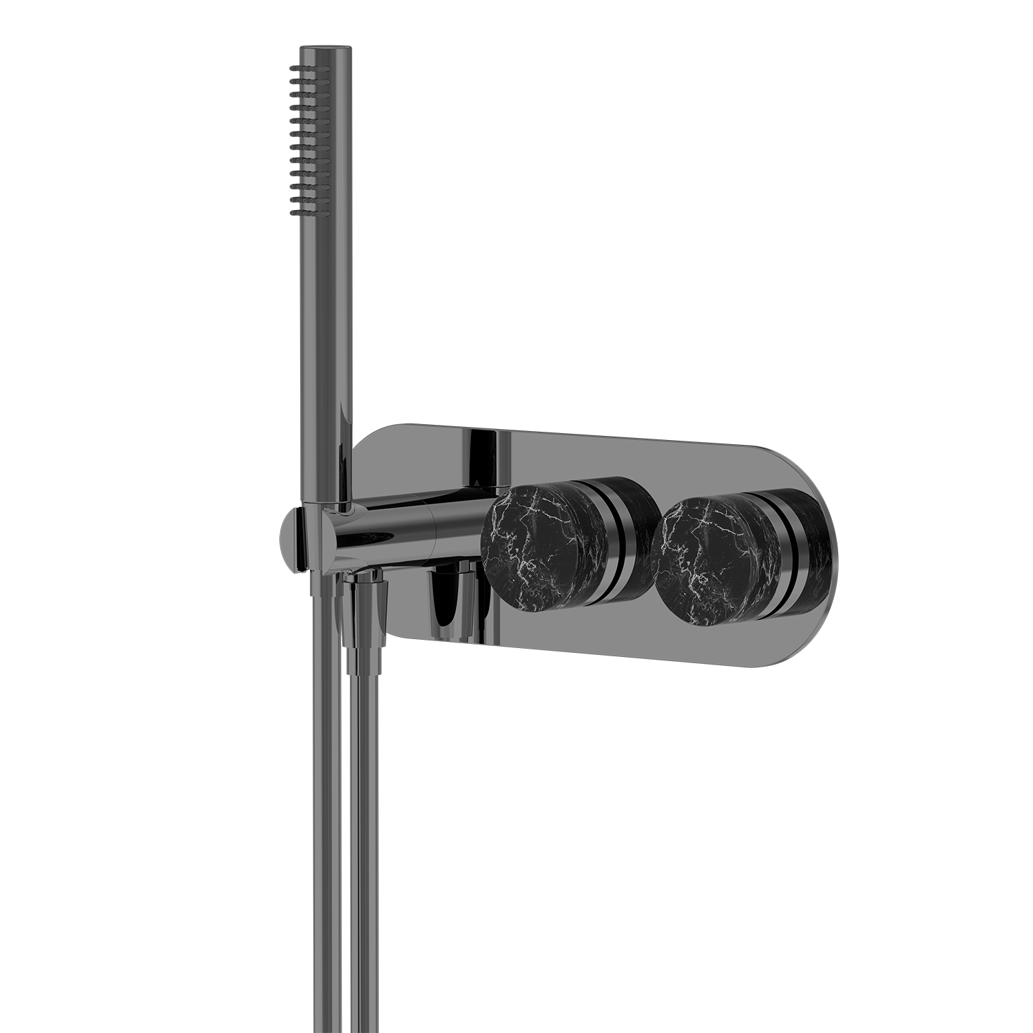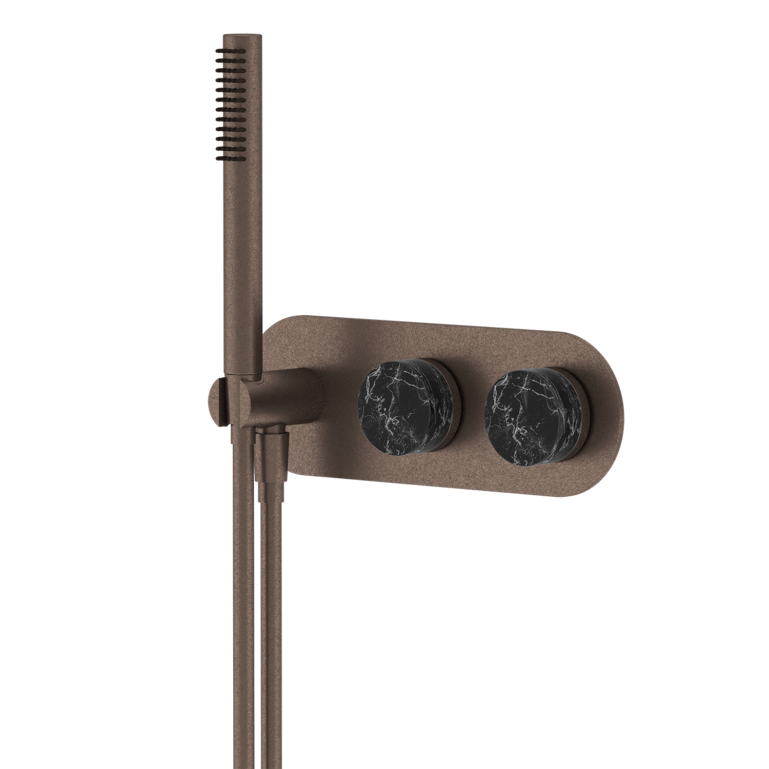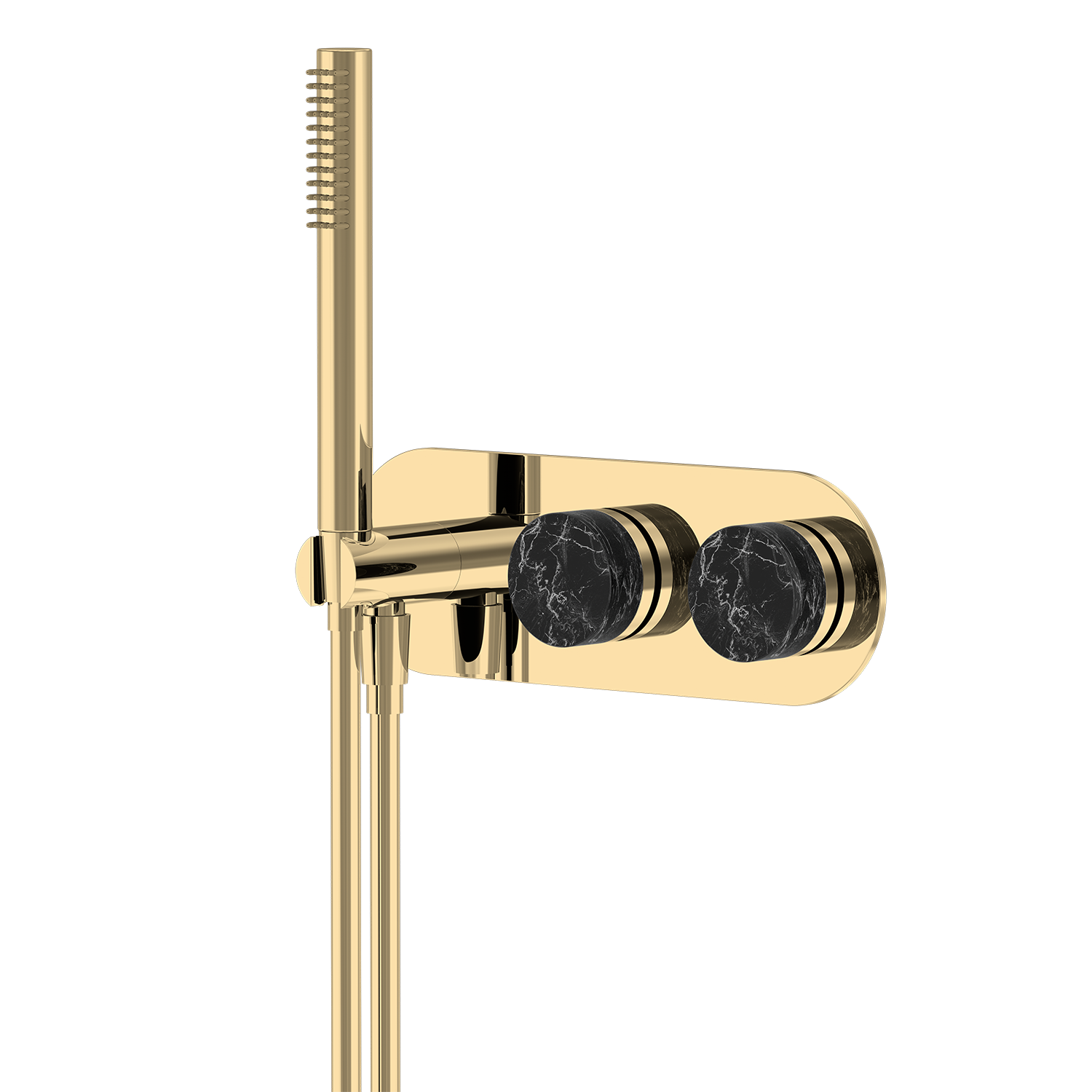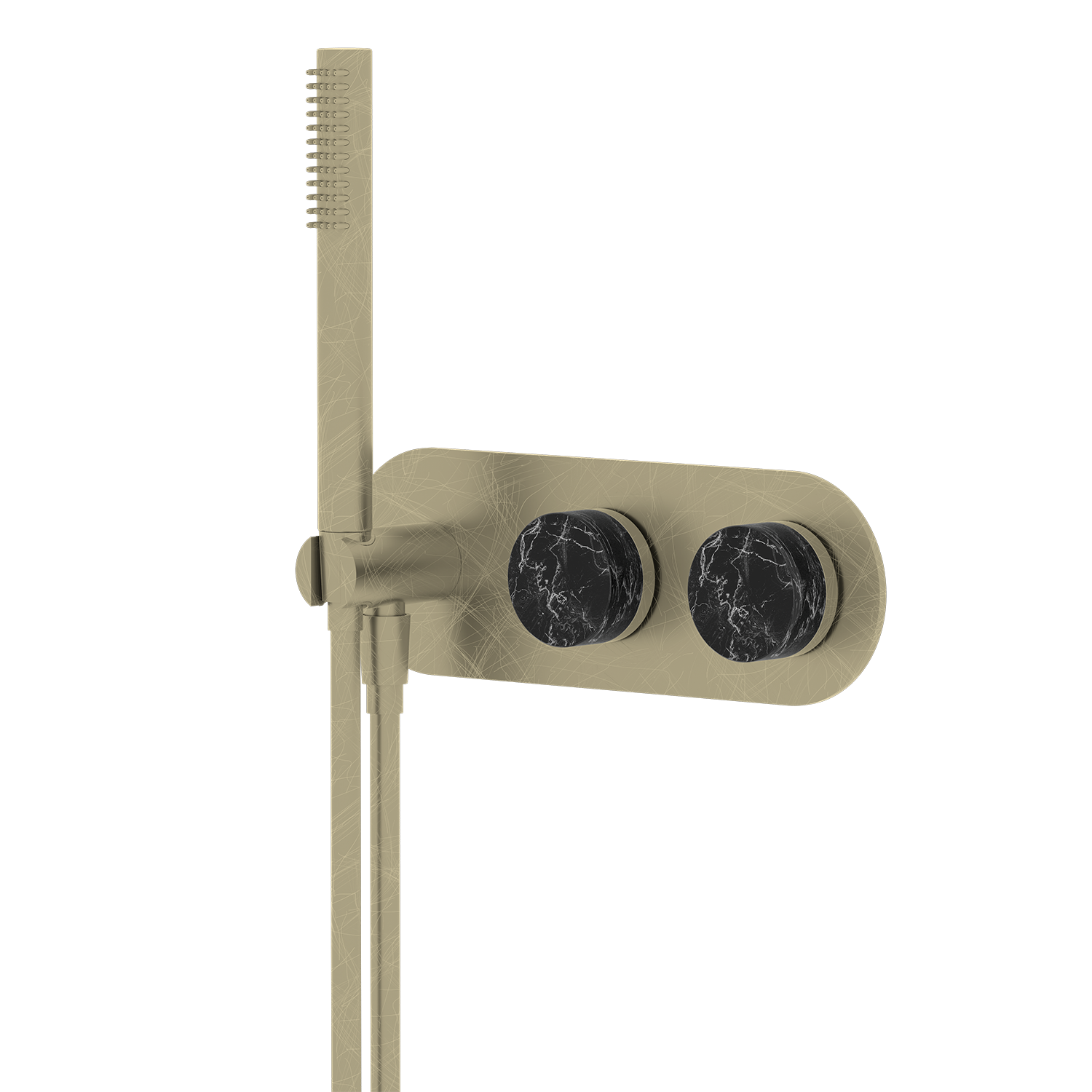 74 Series Handheld Shower Set is a luxury wall-mounted shower system designed for modern bathrooms, combining sleek aesthetics with high-performance durability. Crafted from premium brass construction, this high-end handheld shower set offers superior corrosion resistance and long service life. The brushed gold electroplated finish resists scratches, rust, and fading, making it ideal for humid environments and long-lasting bathroom upgrades. Its refined design features natural black marble decorative accents on the dual-control knobs, characterized by a deep, rich black tone with striking white veining that creates a bold and highly distinctive visual effect. Each marble piece showcases unique, high-contrast natural patterns, enhancing the exclusivity and artistic appeal of this luxury shower fixture. The cylindrical knob design is paired with finely detailed metal edging, creating a layered look that emphasizes both craftsmanship and structural precision. The marble surface is carefully polished to achieve a smooth yet substantial tactile feel, while offering excellent resistance to moisture and stains. Paired with a minimalist brushed gold body, it forms a strong contrast between natural stone and metallic finishes, perfectly complementing contemporary and high-end bathroom interiors. The recessed wall-mounted installation maximizes space efficiency, making it perfect for compact bathrooms and premium architectural projects. Textured knobs ensure non-slip, precise control of water temperature and flow. This premium handheld shower system includes a multi-mode handheld shower head with rainfall and massage spray functions, delivering a flexible and personalized spa-like shower experience. Silicone nozzles allow for easy cleaning and limescale resistance, ensuring consistent performance over time. Equipped with a high-performance ceramic valve core tested for over 1,000,000 on-off cycles, this durable shower set guarantees leak-proof operation and stable water flow. Fully compatible with hot and cold water systems, it is suitable for residential and commercial use. Certified with Watermark and WRAS approvals, this compliant shower system meets strict plumbing standards in Australia, the UK, and global markets. Customization services are available for bulk and project orders, including surface finish customization and logo engraving, allowing seamless integration into branded developments. Ideal for luxury hotels, villas, apartments, and bathroom renovations, the 74 Series handheld shower set delivers a perfect balance of functionality, durability, and premium design. |