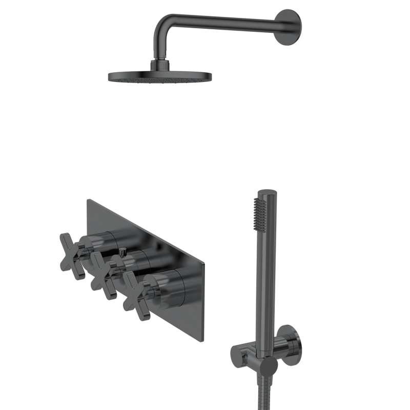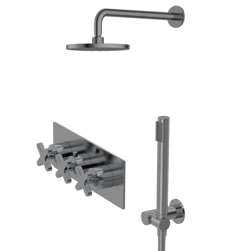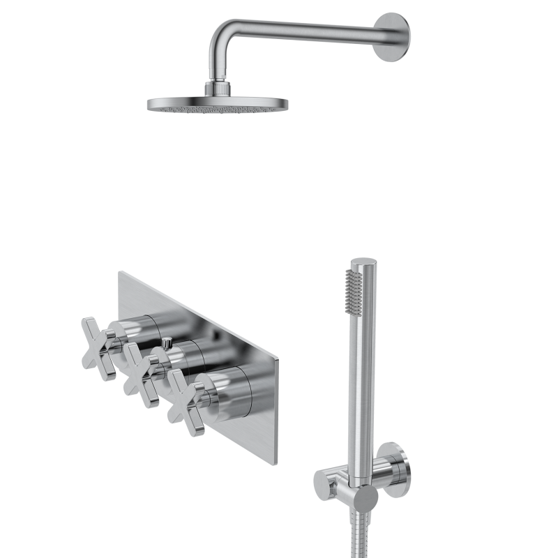 X Series Shower Set is a luxury wall mounted shower system that combines a distinctive X-shaped handle design with high-performance functionality, making it ideal for modern bathrooms and high-end shower upgrades. Engineered for durability and style, this premium shower set is crafted from DZR low lead brass, offering superior corrosion resistance and long service life in demanding environments. Finished with a high-gloss chrome electroplated coating, this modern chrome shower system has been tested with a 48-hour acidic salt spray process to ensure resistance against scratches, rust, and fading. Designed for long-term performance, it is perfectly suited for humid bathroom conditions and daily high-use applications. The bold X-shaped control handles provide precise control of water temperature and flow, while adding a striking geometric element to contemporary bathroom designs. This dual shower head system includes a rainfall shower head and an adjustable handheld shower, delivering both a relaxing overhead rain shower experience and flexible handheld functionality. The sleek, minimalist design makes it a perfect fit for modern, minimalist, and luxury bathroom interiors. This high pressure shower system is equipped with a premium ceramic valve core (Spanish brand), tested for over 500,000 on/off cycles to ensure leak-proof performance and stable water flow. Supporting both hot and cold water systems and operating within a pressure range of 0.05–0.8 MPa, this versatile shower set is compatible with most residential and commercial plumbing systems. Certified with Watermark approval, this compliant shower system meets strict international quality and safety standards, making it suitable for Australia and global markets. Customization options are available for large-scale projects, including surface finish customization and logo engraving, allowing seamless integration into branded developments. Ideal for hotel bathroom renovations, luxury homes, boutique apartments, and modern residential projects, the X Series luxury shower set delivers the perfect balance of durability, performance, and contemporary design. |